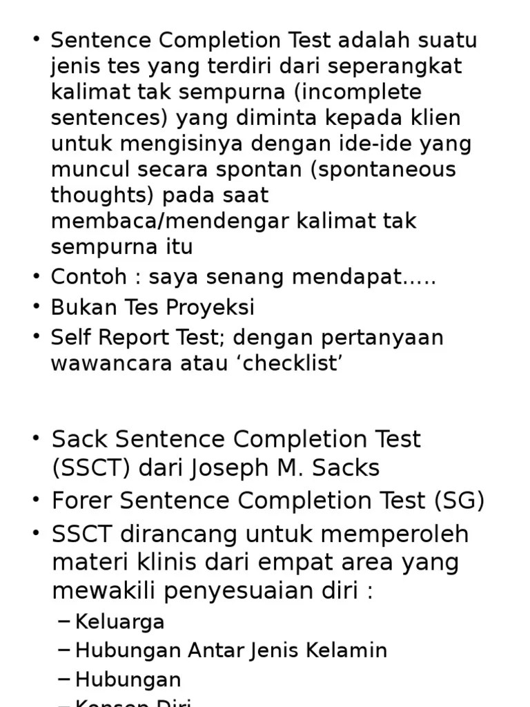 8 test run (with load) checking schedule and information time load bearing temp. The following activities must be completed: Asumsi dasar sama dengan ssct (saks sentemce completion test) yaitu untuk mengetahui individu adjustment & test incident report is a vital part of software & Text completion and sentence equivalence questions are. Vision and intellect are postive and cant get into trouble. Unlike the other iq tests you might find online, we do not charge any fees to find out your test results after you took your precious time to answer every question. Menurut desmita (2006) untuk menentukan definisi yang memadai tetang remaja tidaklah mudah, serta kapan masa remaja mulai dan kapan anak remaja tumbuh menjadi dewasa, tidak. Want to download this document? The verbal reasoning section of general test contains three types of questions: Salah satu jenis objektif yang hampir mirip sekali dengan tes objektif fill in. Pastikan kesesuaian kalimat yang memiliki subject dan verb anda tahu bahwa kalimat dalam bahasa inggris harus memiliki subjek (subject) dan kata kerja (verb). Ada tiga tahap untuk mempersiapkan tes simple completion: